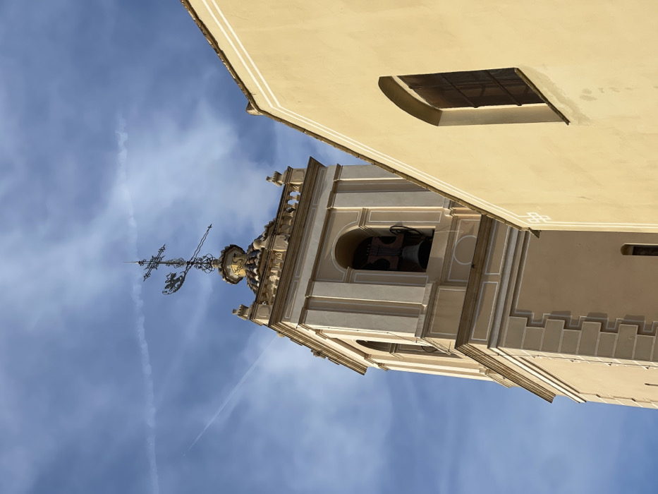An upward-angled view captures a section of a church building and its bell tower against a partly cloudy blue sky, located in the city of Paiporta, Spain