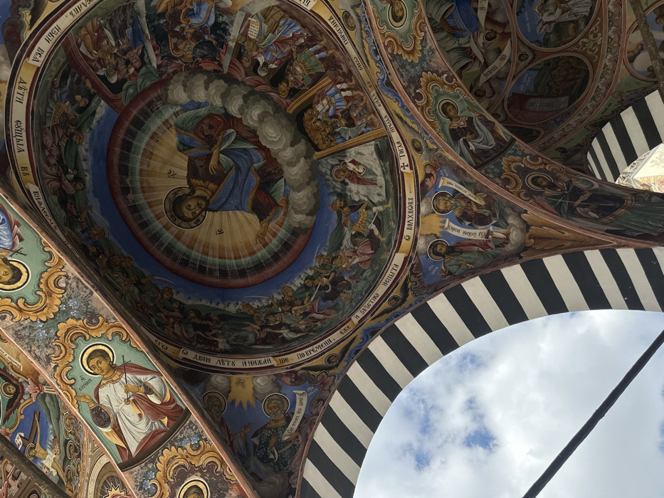 - "The image displays an upward view of the intricately frescoed ceiling and architectural structures of the Rila Monastery in Rilski manastir, Bulgaria" by FM-ifIs33, licensed under CC BY 4.0