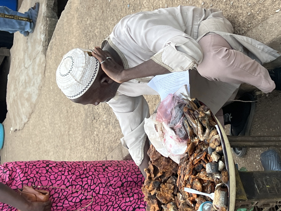A man wearing a white skullcap, beige shirt, and light pink pants is bending over a large tray of dried fish. He rests his hand on his forehead and looks down at the fish. A paper with text on it is tucked beside the fish. A person in a pink patterned dress and a purse is seated nearby. A pair of black shoes are visible in the background.