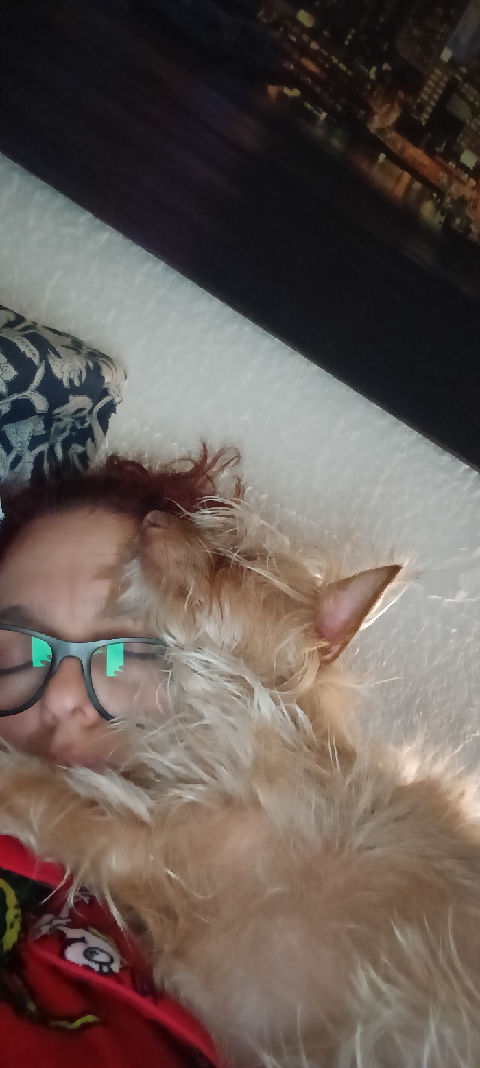 - "A person wearing glasses is lying down, possibly on a bed, with a light brown, fluffy dog nestled against their face and chest" by FM-54X7R2, licensed under CC BY 4.0