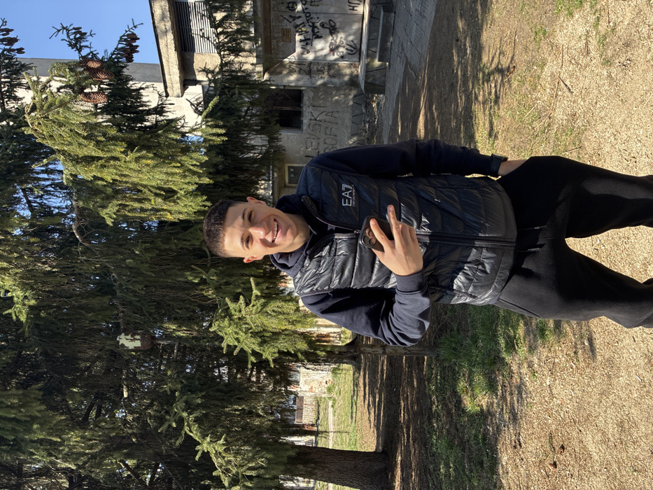 A young adult male subject stands centrally in an outdoor setting in Bansko, Bulgaria, on a clear, sunny day