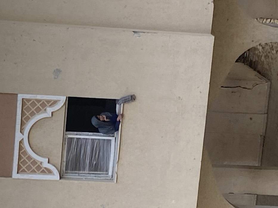 This image captures the exterior of a building in al-Qarara, Palestinian Territory. A single individual, appearing to be a female wearing a grey head covering and a dark blue long-sleeved garment, is positioned leaning out of an open window on an upper floor. Her right hand is supporting her chin as she gazes towards the right side of the frame. The window features white frames; the left pane is covered with a translucent, possibly plastic, film, while the right pane is open to a dark interior. Above the window, there is an arched decorative element with a light-colored frame and a geometric lattice pattern set against a brown background. A grey cloth item is draped over the exterior sill of the open window. The building's facade is a light, neutral color, possibly beige or light tan, and exhibits minor discolorations. Below the window, an arched opening leads to a recessed lower section of the building where the ground appears uneven and damp. Vertical cracks are visible on the walls within this lower area.