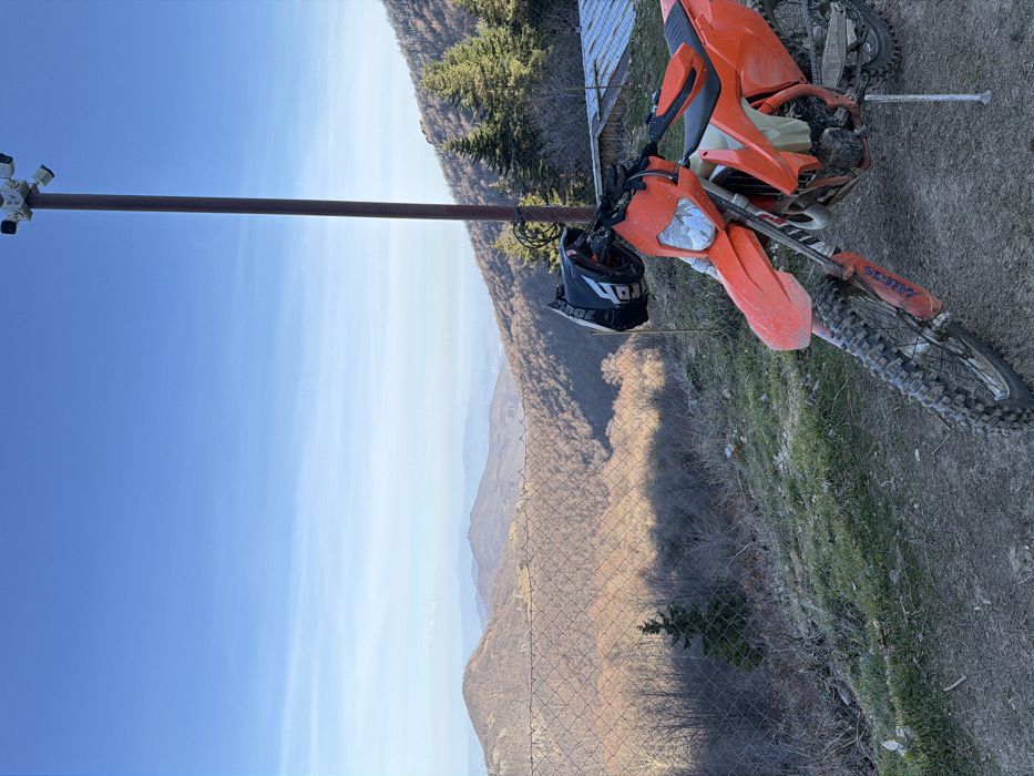 An orange dirt bike, covered in mud and dust, is parked on a dirt and grassy patch of ground in the foreground, facing left