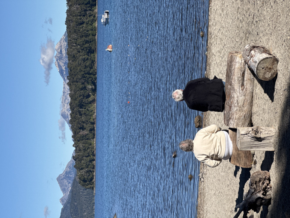 The image depicts a tranquil lakeside scene in the Municipio de Villa La Angostura, Argentina. Two individuals, observed from behind, are seated on cut logs on a sandy beach in the foreground, facing the large blue lake and distant mountains. The person on the left wears a light-colored long-sleeved garment, while the person on the right wears a dark-colored long-sleeved garment. Both appear to be adults with light-colored hair. The lake's surface is mildly rippled. Across the lake, a dense, dark green forest lines the distant shore, behind which several large mountains with snow-capped peaks are visible against a clear, bright blue sky with scattered white clouds. On the lake itself, an orange partially submerged object and a smaller orange buoy are visible, along with a string of small white buoys and a white motorboat anchored or docked further to the right. The immediate beach area includes additional natural logs and branches.