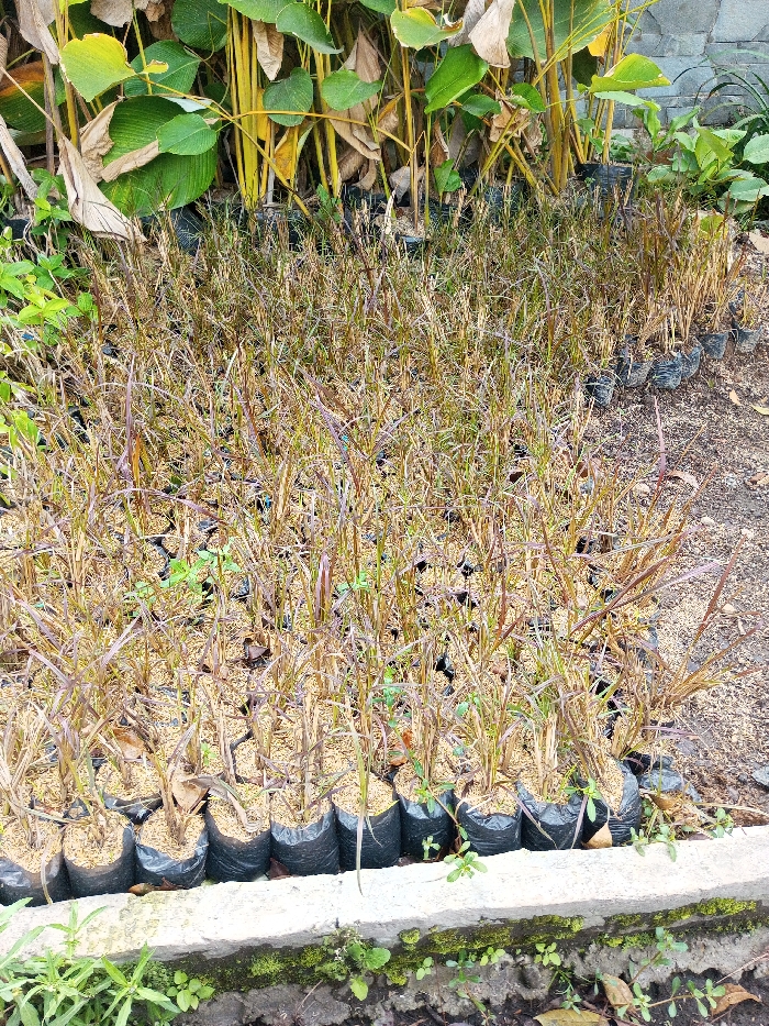 The image displays an outdoor plant cultivation area located in Sandamal Eliya, Sri Lanka. In the foreground, a light-colored concrete curb extends horizontally. Immediately behind this curb, numerous small, herbaceous plants, characterized by reddish-brown and green stalks, are arranged in dense rows. Each plant is individually potted in a small, black plastic polybag containing a light brown, granular substrate. These potted plants occupy the midground, extending backwards in parallel lines. The background consists of a dense mass of larger foliage plants with broad green and yellow-brown leaves. A section of a dark grey, possibly stone or concrete, wall is partially visible through the foliage on the right side of the background. The ground visible between and around the planted areas is dark soil with scattered organic debris. No individuals are present, and no active interactions are depicted.