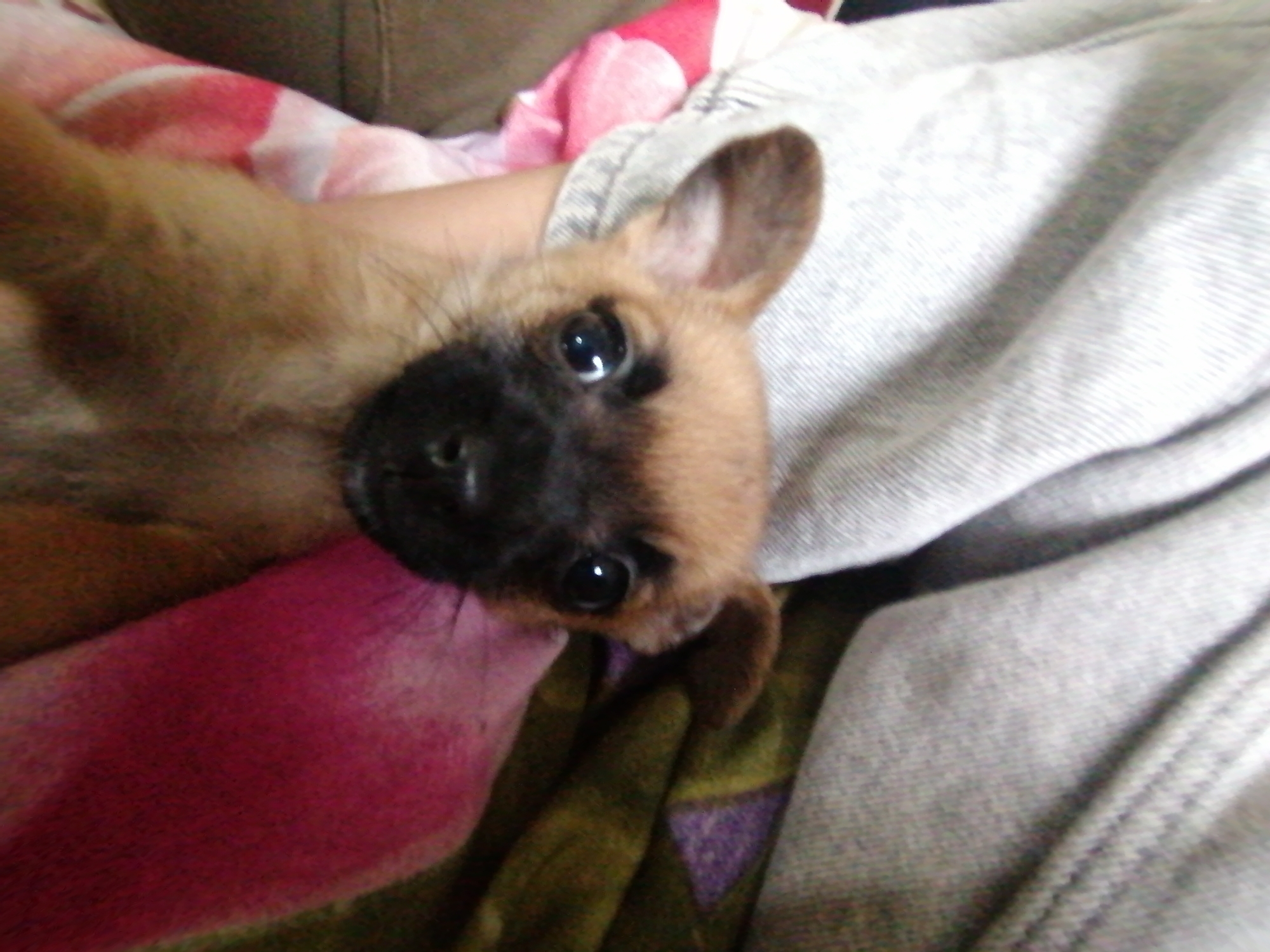 - "A brown and black puppy lies in a person's lap, which is covered with a pink and white patterned cloth" by FM-535o93, licensed under CC BY 4.0