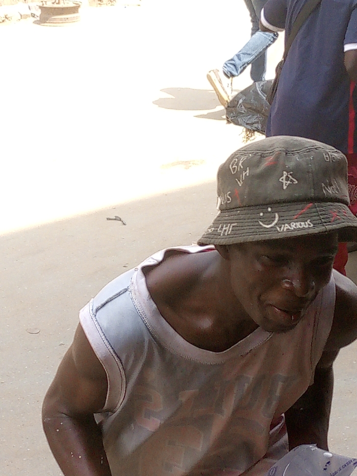 The image depicts an outdoor scene in Fegge, Nigeria, under bright daylight. The primary subject is an adult male with dark skin, positioned in the lower center and right of the frame. He is wearing a dark green bucket hat adorned with white and red graffiti-style markings, including text like "BR WH," "VARIOUS," stars, and a smiley face. He wears a light-colored, possibly white or light blue, sleeveless undershirt, which shows moisture or stains. His face is visibly wet, with liquid present beneath his nose and dripping onto his chin. He is looking downwards and to his right, and his right hand appears to be holding a white plastic sachet or bag, partially obscured at the bottom of the frame. To the upper right, partially visible behind the primary subject, is the lower body of another individual. This person is wearing blue jeans and light-colored shoes, with a dark blue shirt also visible. They are carrying a black plastic bag that contains what appears to be dried organic matter. The ground surface is light-colored, suggesting dirt or light-colored pavement, with shadows cast by people and objects. In the far upper left background, a circular metallic object, resembling a discarded vehicle rim or similar, rests on the ground. The scene indicates an urban or semi-urban outdoor setting.