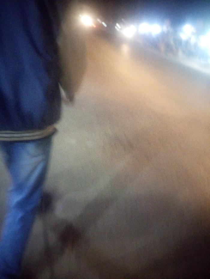 A blurred image depicts a person wearing a dark jacket and blue jeans walking on a dimly lit street. The foreground is obscured by fog or haze. Car headlights are visible in the distance, providing the main light source. The ground appears to be a dark pavement, with shadows cast by the person. The overall atmosphere is hazy and indistinct.