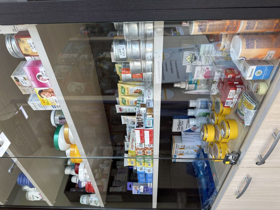 This image depicts the interior of a retail display cabinet, located within a commercial establishment in Karlovo, Bulgaria. The cabinet features three visible shelves behind clear glass doors, situated above a lower, light-colored wooden cabinet with two silver-toned pull handles. No individuals are present in the scene. The shelves are uniformly constructed from light-colored wood laminate. The top shelf contains assorted cosmetic and personal care products, including multiple jars with white, blue, green, and gold lids, some stacked. Brands such as "Ice Cream" are discernible. Various boxed items, some displaying images of human faces, are also present, with visible pricing in Bulgarian Leva (e.g., "3,87 лв.", "2,93 лв.", "4,11 лв.") and some in Euros (e.g., "2,10 €"), indicating local currency and potentially dual pricing. Products identified include "Euterpa" and "Verena." Several cylindrical, silver-colored lidded tins are arrayed on the right side of this shelf. The middle shelf features a dense arrangement of numerous tubes and small boxes, primarily for skincare or cosmetic applications. Brands like "Деча", "Роза", "Българска Природа", and "Вадене" are partially visible on various product tubes. A row of silver-colored lidded tins, similar to those on the top shelf, also displays pricing in Bulgarian Leva. The lowest visible display shelf holds a variety of items. Multiple bottles, some labeled "ClinSkin Poplom," are arranged towards the left. A prominent cluster of approximately nine small, round jars with yellow lids is visible in the center. To their right, several rectangular red boxes are stacked. Additional products, including those labeled "Foot Ness" and "Heavy Duty," are also present. A black and silver security sensor is affixed to the glass door on the left side of this shelf. Towards the right, several tall, cylindrical containers, some orange-brown, are stacked, with one box labeled "Himalaya." Reflections on the glass doors obscure some product details and show indistinct elements of the surrounding interior environment, including a reversed word "DIFFERD" on the top shelf.