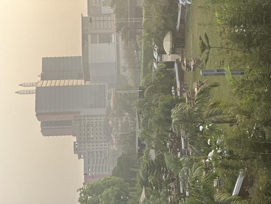 A hazy cityscape features tall buildings under construction, fading into a muted sky. In the foreground, lush green trees and palms obscure portions of the view. Outdoor seating areas with tables and chairs are visible amidst the greenery. The overall scene evokes a sense of urban development juxtaposed with nature, all shrouded in a slightly obscured atmosphere.