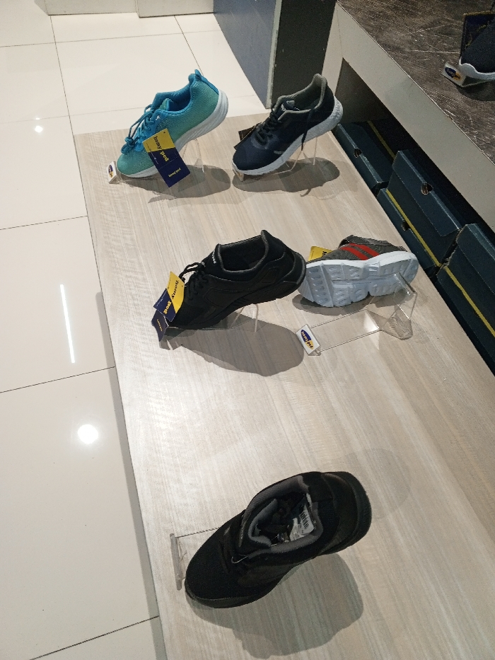 The image depicts an interior retail display area within Sandhikharka, Nepal. The scene showcases five individual athletic or casual shoes displayed on transparent acrylic risers on a light wood-grain patterned surface. To the left, a white tiled floor reflects overhead lighting. To the right, a dark vertical partition is visible, with dark blue shoe boxes featuring yellow banding stacked beneath it. Specific items include: - A teal/light blue mesh shoe with white laces and sole, positioned top-left, bearing a blue "Bonny Ped" tag. - A navy blue mesh shoe with white laces and sole, located top-right. - A black mesh shoe with black laces and a dark sole, situated mid-left, displaying a yellow and blue "Bonny Ped" tag. - A grey mesh shoe with red side stripes, white laces, and a thick light grey sole, positioned mid-right, also featuring a "Bonny Ped" tag. - A black shoe, possibly a high-top sneaker or boot, with black laces and a dark sole, placed bottom-center, showing a grey interior lining. No individuals or active interactions are present in the static retail environment.