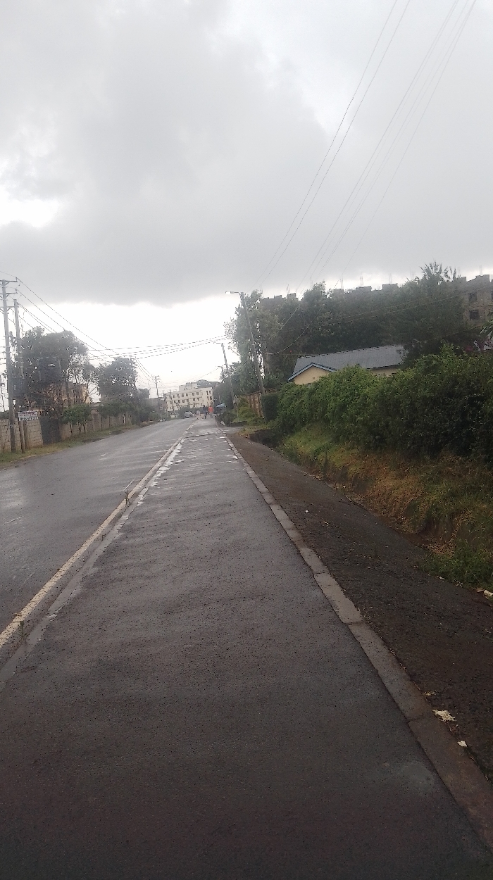 A street scene under a cloudy sky. The road is wet and stretches into the distance, flanked by a sidewalk on the right and a white line marking the edge on the left. Buildings are visible in the background, partially obscured by trees and bushes. Power lines crisscross the sky. The overall mood is gray and overcast.