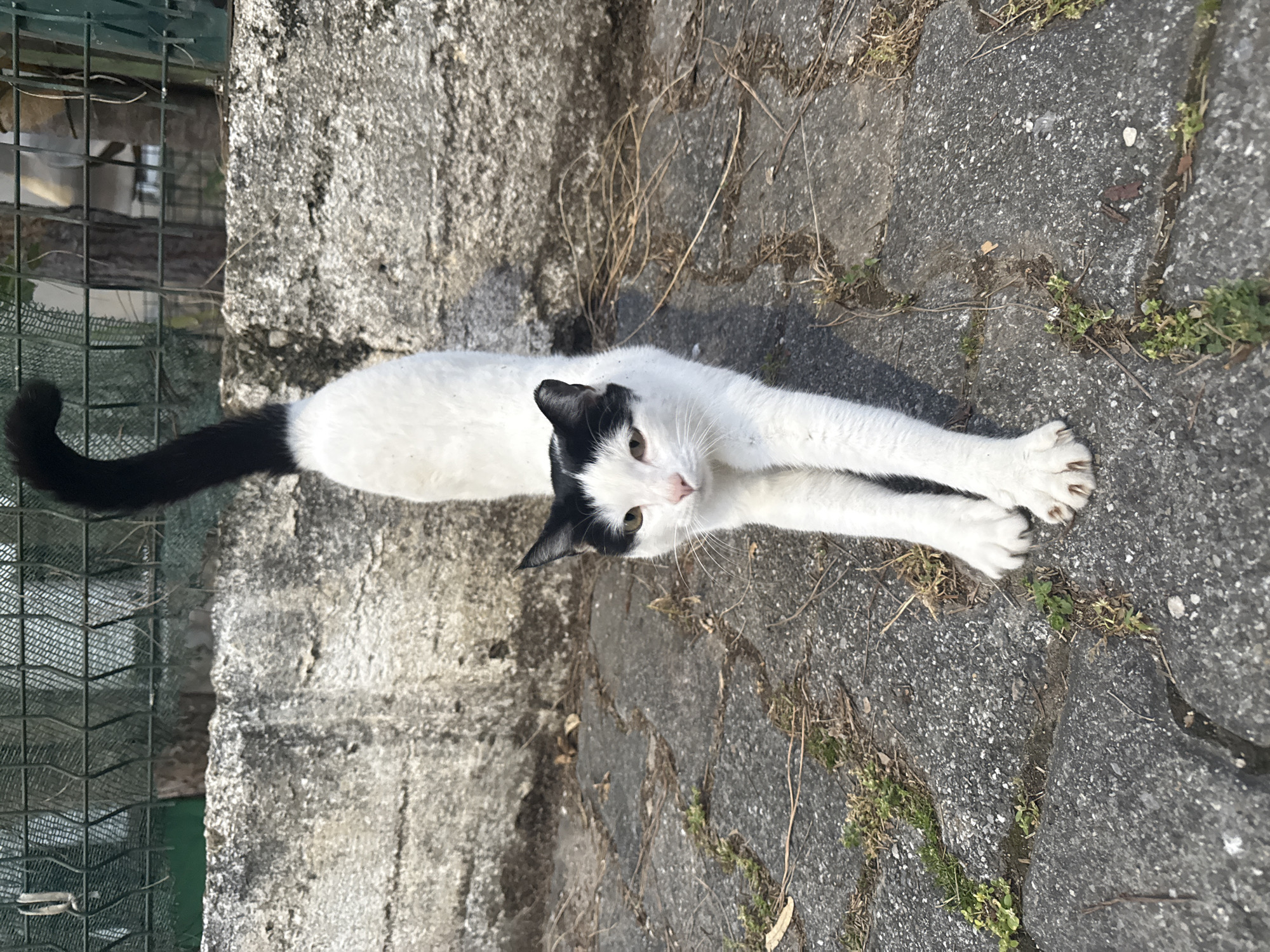 - "A white cat with black markings on its head and a black tail stretches out on a gray stone surface" by FM-tiOZv1, licensed under CC BY 4.0
