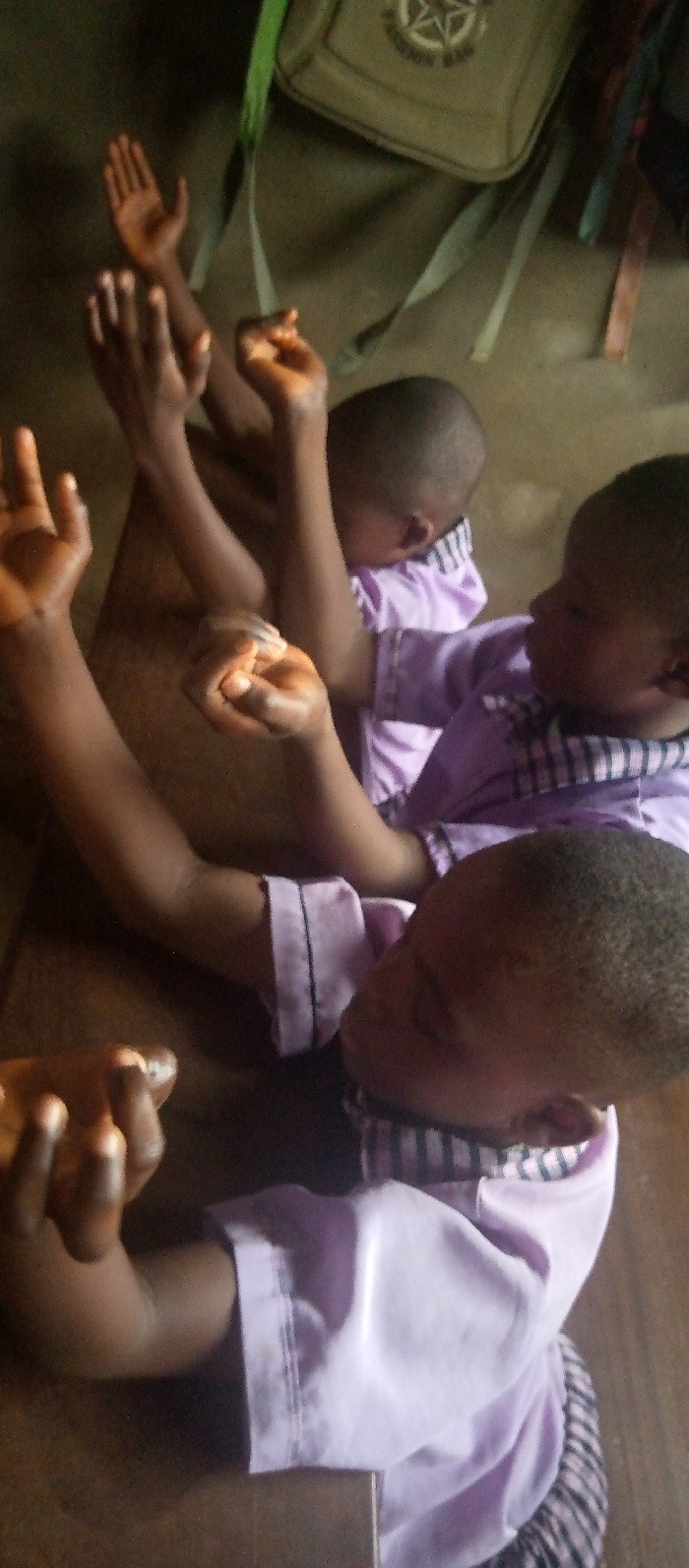 Three individuals are depicted indoors in Ukwu-Abwa, Nigeria. The subjects, with dark skin tones, are positioned at wooden desks. Each wears a light purple shirt featuring a black and white striped collar. Their arms are raised vertically, hands in varied open or loosely fisted gestures. A khaki backpack with a green strap and a circular emblem containing a star design is visible in the upper background. The setting appears to be a classroom.