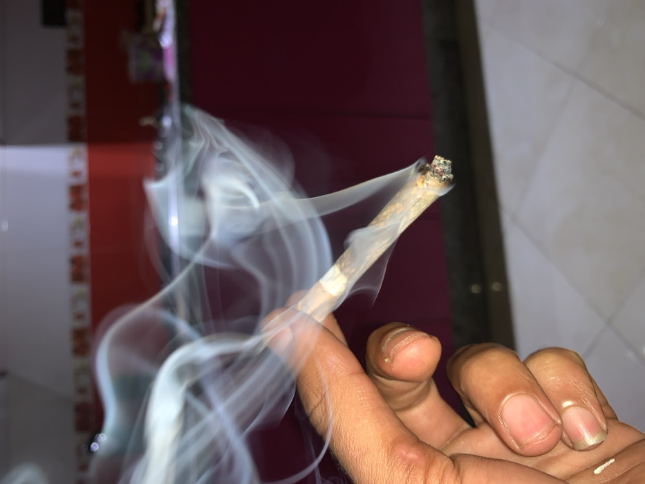 A close-up image, set in an indoor location within M'diq, Morocco, depicts a human right hand holding a lit, hand-rolled cigarette (joint)