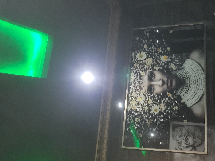 A framed portrait dominates the scene. It depicts a woman with a cascade of white flowers adorning her head, and a woven neck piece. The image has a grayscale effect. Below and to the right is a smaller image with a similar aesthetic, showing a rose. A bright, green rectangular light source is visible on the opposite side of the frame. The background appears dark, with a strong light source nearby causing a glare.