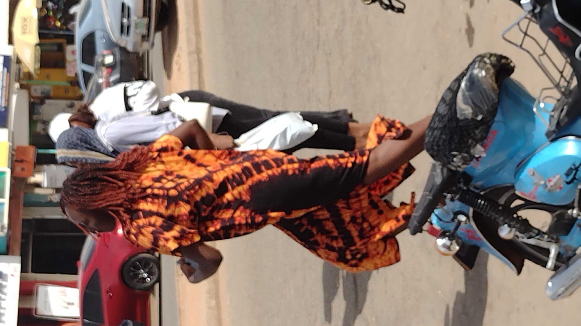 The image depicts a street scene in Jos, Nigeria, under bright daylight conditions. In the foreground, a dark-skinned individual with reddish-brown dreadlocks is in mid-stride, moving towards the right. This person wears a long, loose-fitting garment with a distinctive orange and black tie-dye pattern. Behind them, slightly to the right, a second individual, also dark-skinned, walks in the same direction. This person wears a light blue long-sleeved shirt, dark trousers, and has a light-colored headscarf draped over their head and shoulders, carrying a white bag in their left hand. A third person, partially obscured behind the second, is visible wearing a white baseball cap and a white top. At the bottom of the frame, a light blue motorcycle, possibly a Honda Cub model, is parked or stationary. It features silver exhaust and chrome elements, with red decals on its bodywork, and a black seat cover. In the mid-ground, a red sedan with black rims is visible on the left, parked or stationary. Further in the background, several other vehicles, including a silver sedan and a dark-colored sedan, are present on what appears to be a paved road. The background also reveals commercial buildings or market stalls, indicated by various structures, including a yellow umbrella with partially legible text, potentially "TOX," suggesting a retail presence. The overall environment is an urban street or roadside.