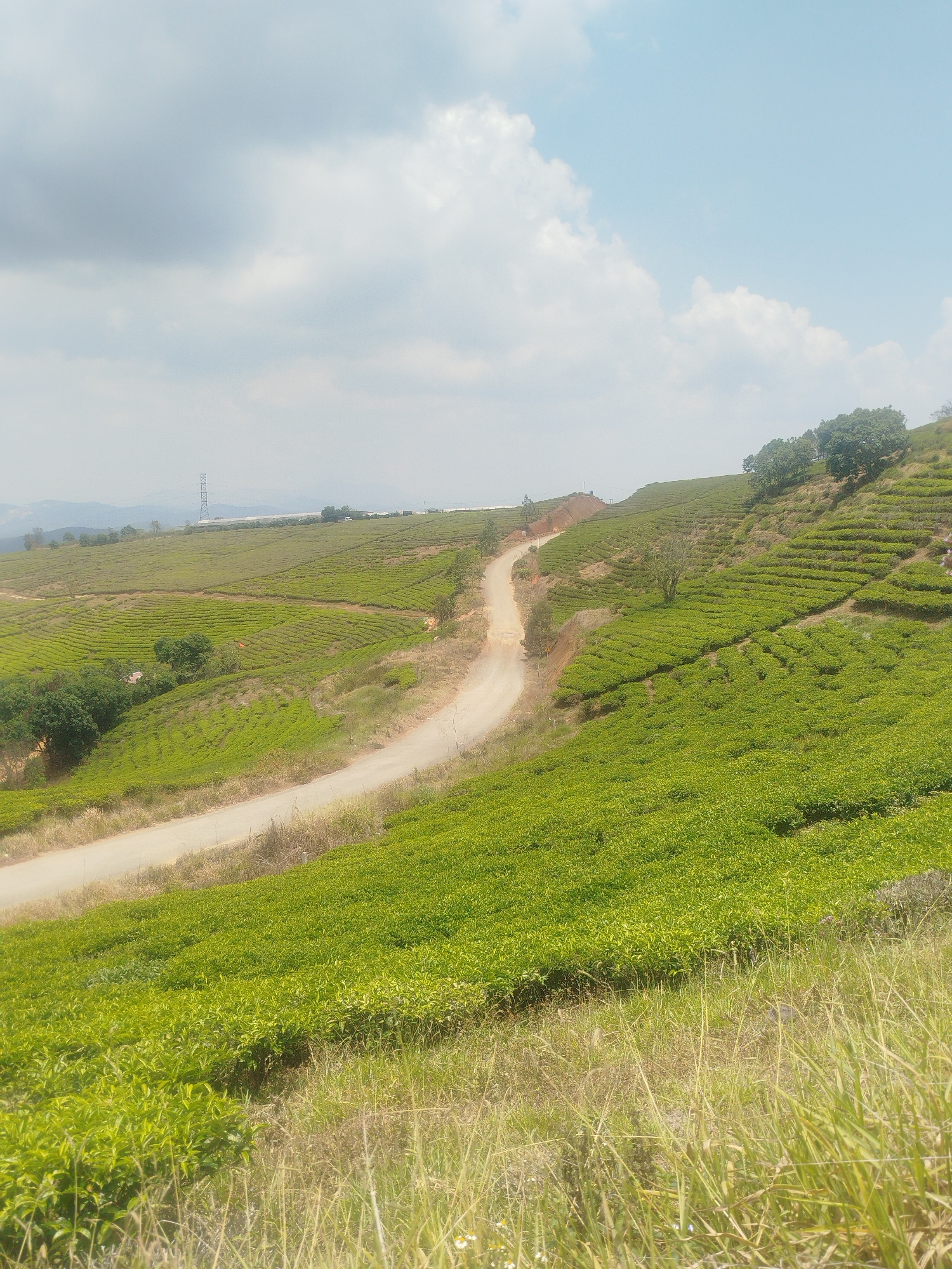 The image depicts a tea plantation in Phát Chi, Vietnam. Green tea bushes cover rolling hills, arranged in neat rows. A dirt road winds through the landscape, ascending a hillside. In the background, a power line structure is visible. The sky is partially cloudy with areas of blue. The foreground features tall, dry grass. No people are visible.