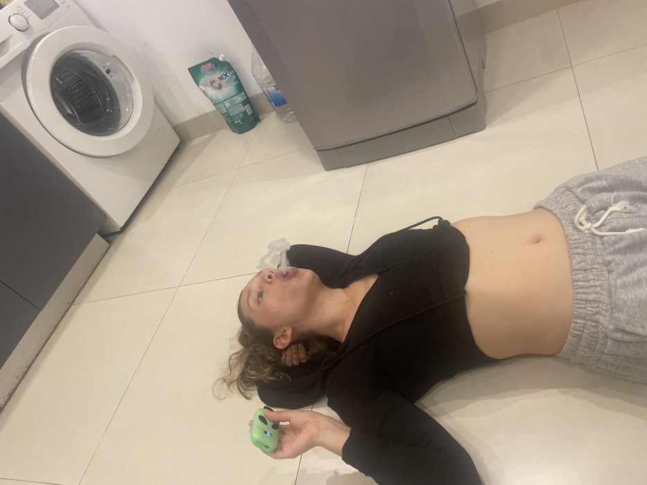 An indoor scene, likely a utility area or laundry room within a domestic or hotel setting in Nha Trang, Vietnam. A female individual with light skin and curly light brown hair, wearing a black cropped hooded top revealing her midriff and grey sweatpants with a white drawstring, lies supine on a light-colored tiled floor. Her head is oriented towards the upper-left of the frame. She exhales a distinct cloud of white vapor from her open mouth. Her right hand (viewer's left) holds a small, light green, cartoon-styled device, consistent with an electronic vaping device, featuring black eyes and a pink mouth. Her left hand is positioned behind her head, resting on the floor. In the upper-right quadrant of the frame, a white front-loading washing machine is visible above a dark grey base. On the floor or a low surface next to the washing machine, a crumpled green plastic pouch of "Ariel 10X" laundry detergent and a clear plastic water bottle are present. A dark grey appliance or counter unit extends vertically along the right edge of the frame. A dark grey horizontal surface, possibly an overhead cabinet, is visible in the upper-left.