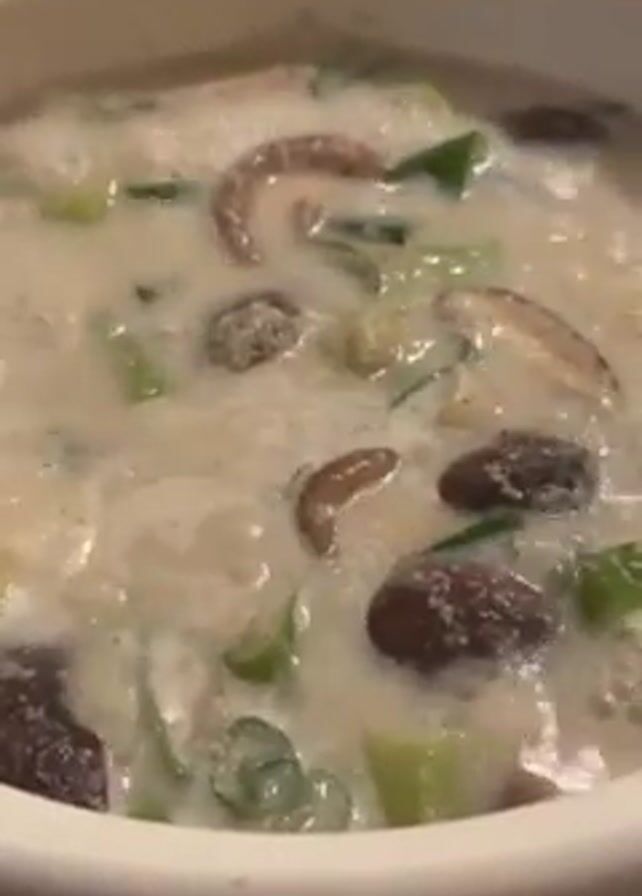 close-up view of a white ceramic pot filled with a creamy, light-colored soup. Visible in the soup are several dark brown and tan sliced mushrooms, as well as chopped green onions or scallions. The soup appears to be simmering or just finishing cooking, as small bubbles are visible on the surface. The pot itself is simple in design, with a plain white exterior and a rounded shape. The shot is steady and focused on the soup within the pot.