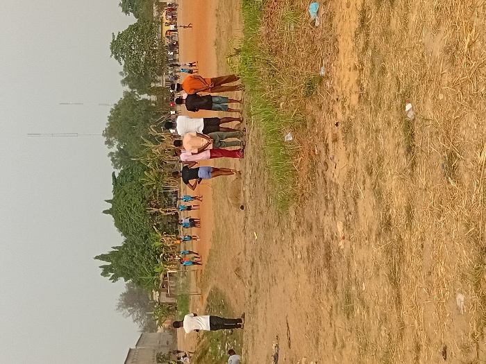 An outdoor scene in an unpaved, open area in Unknown, Chad, is depicted under a hazy, light grey sky