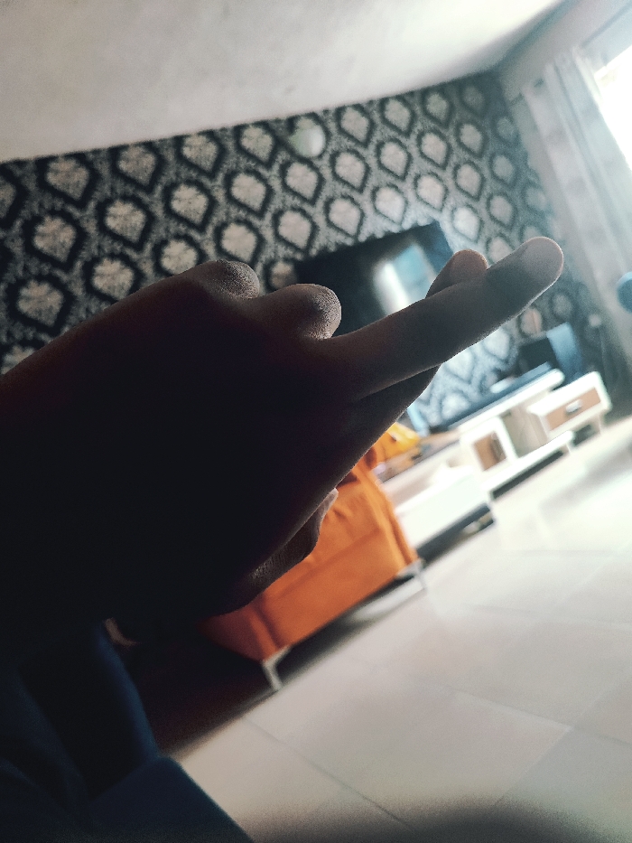 The image captures an interior living space located in Iju, Nigeria. In the foreground, a heavily shadowed, dark-skinned human hand is prominently featured, with the index finger extended upwards and the remaining fingers curled into a fist, forming a discernible gesture. A sliver of blue fabric is visible at the bottom left, partially obscuring the lower arm or leg. The background displays a wall covered in wallpaper featuring a repetitive pattern of dark, stylized tear-drop or leaf shapes against a lighter background. To the right of the hand, a section of an orange sofa with metal legs is visible. Further back, a white media console with light wood-paneled drawers supports a dark, reflective flat-screen television. The floor is composed of large, light-colored square tiles. A bright light source, originating from a window partially covered by curtains, is present on the far right, creating strong backlighting and lens flare.