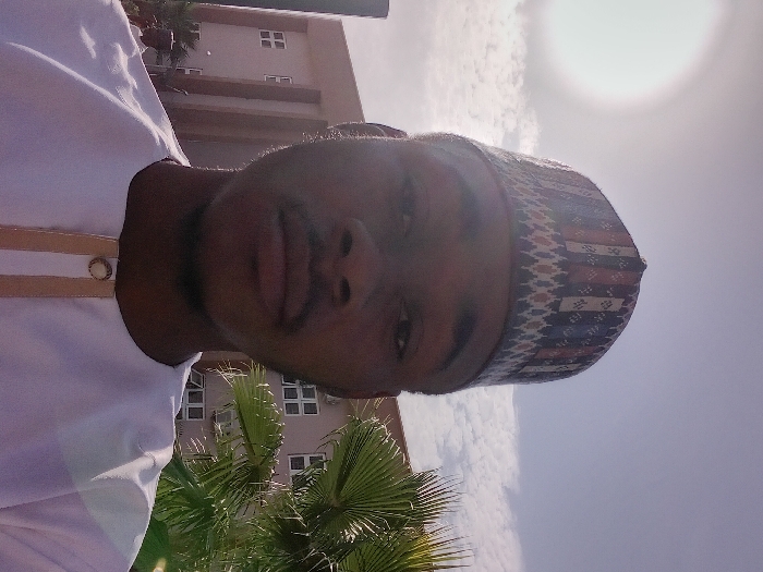 A male individual, appearing to be a young adult with a dark skin tone, is centered in a close-up, upward-angled shot taken outdoors in Kwazailewa, Nigeria