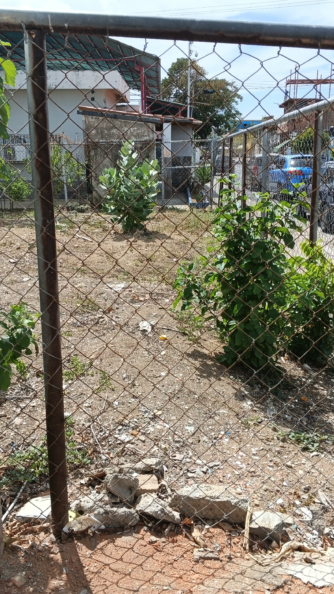 The image depicts a fenced-off, unkempt lot. The fence is made of rusted chain-link, with metal poles providing support. Within the lot, the ground is barren and covered with dirt, small rocks, and scattered trash. Several small green bushes or plants are growing sporadically throughout the area. In the background, beyond the fence, are buildings and infrastructure, suggesting an urban or suburban setting. The buildings have a mix of architectural styles and appear to be in varying states of maintenance. A blue vehicle is visible parked in the background. The lighting suggests a sunny day. The image is taken from a perspective looking into the lot through the fence.