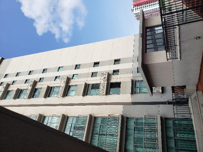 A low-angle view reveals a multi-story building with a grid-like pattern of windows. The building's facade is a mix of beige and gray tones, contrasted by a blue sky dotted with white clouds above. Balconies with black railings jut out from the side of the building. Part of another building with red and white colors peeks from the upper corner.
