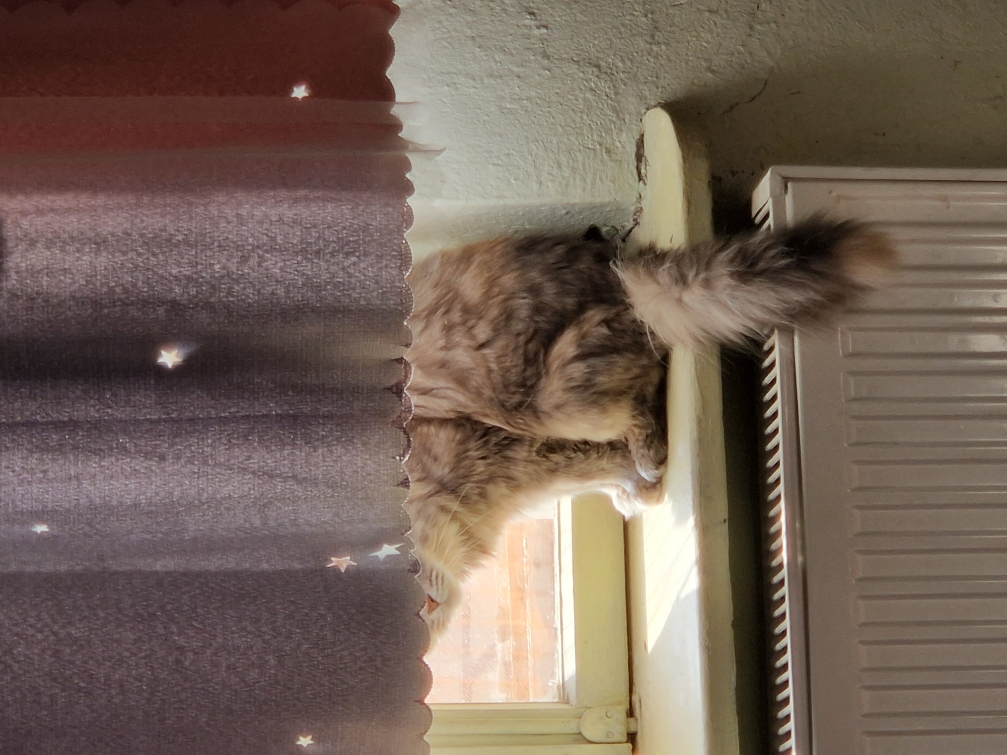 A medium shot depicts a cat perched on a window sill in a room in Raduvene, Bulgaria. The cat, which is brown and grey, is partially obscured by a curtain hanging to the left of the frame. The curtain is decorated with small star patterns. To the right of the cat is a radiator, attached to the wall. The room has light green walls, and the sunlight streams in through the window. The cat’s tail extends towards the radiator.