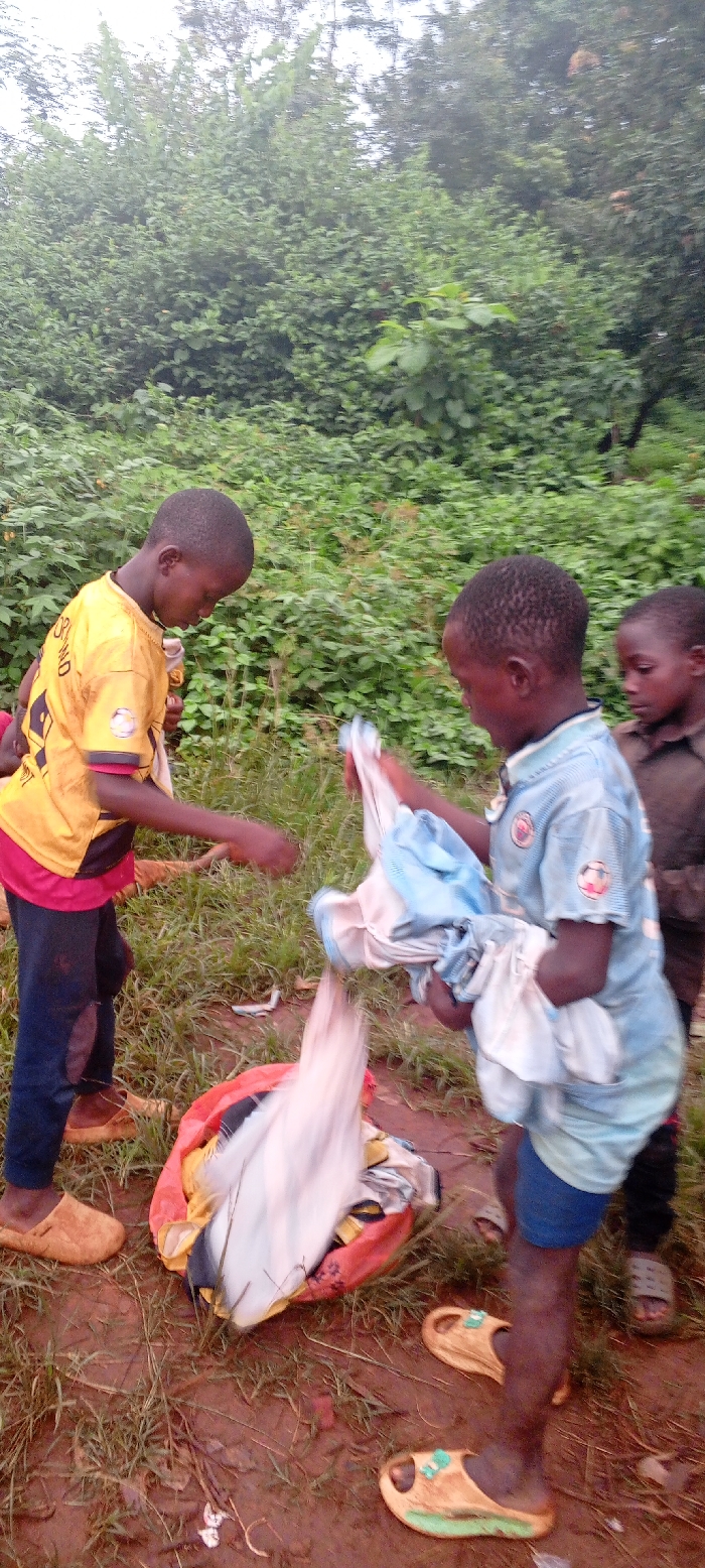 Three children stand outside near a collection of greenery. One wears a yellow shirt, ripped jeans, and tan slippers. He reaches toward a bag of clothing. A second child, dressed in a blue shirt and shorts, holds up a pile of white and blue garments. The third child looks on, wearing a brown shirt. The ground appears muddy, and all children wear open-toed footwear.