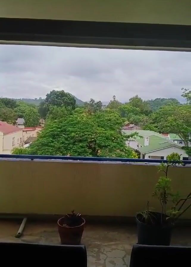 view from a balcony overlooking a residential area filled with lush greenery. The sky is overcast. In the foreground, there are two black chairs and a few potted plants on the balcony floor. The balcony has a low wall with a blue trim. Beyond the balcony, there are houses with red and green roofs, interspersed with trees. The scene appears to be calm and quiet.