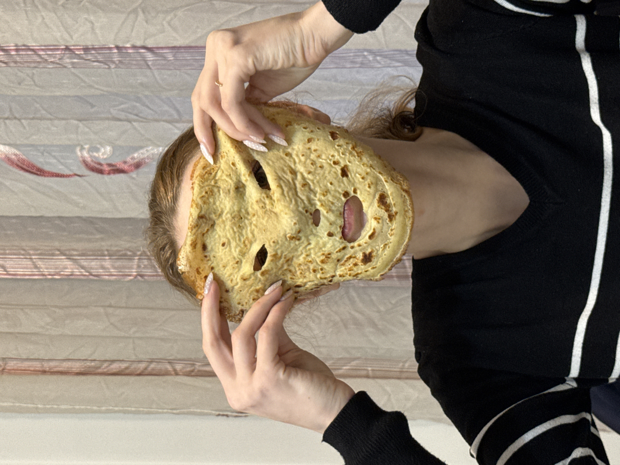 A woman is holding a large pancake or crepe with several holes cut in it up to her face, using it as a mask. Her hands are visible, with long fingernails, one wearing a gold ring. She is wearing a black sweater with white stripes down the sides. The background is a horizontally striped curtain with shades of grey, white, and pink. It is not possible to verify the location of the image in Kragujevac, Serbia from the visual information provided.
