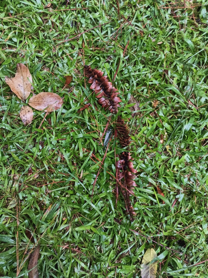 A patch of green grass covers the scene. Scattered throughout are brown pine needles and a few damp, decaying brown leaves. A long, segmented pinecone lies diagonally across the frame, its brown scales detailed against the bright green grass. A small, shiny, possibly wet object rests near the cone. The overall impression is of a natural, somewhat untidy outdoor setting, likely after a rainfall.