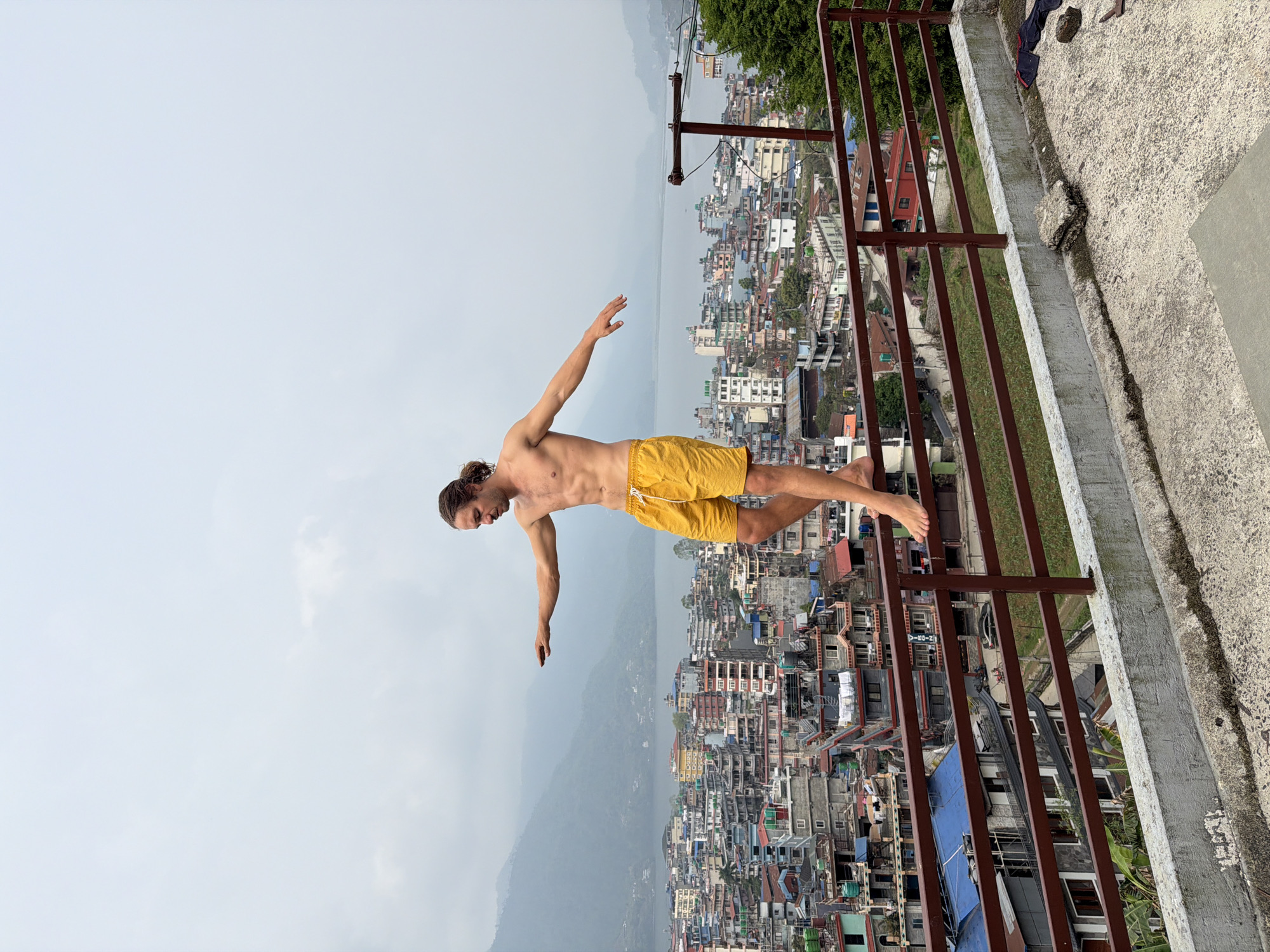 A man with long hair is balancing on a railing. He is wearing yellow shorts, and his arms are outstretched. The railing is on a rooftop overlooking the city of Pokhara, Nepal. Mountains are in the background.