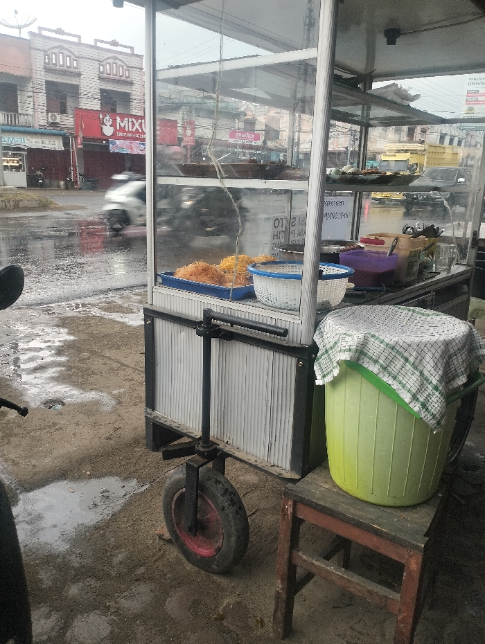 A food cart sits on a wet, gray street. The cart is constructed of metal and glass and displays food items inside. A small wheel is visible on the side of the cart. Next to the cart, a light green bucket, covered with a white and green checkered cloth, sits on a small, wooden stool. In the background, buildings and a passing scooter are visible. The overall scene conveys a sense of a rainy day in a commercial area.