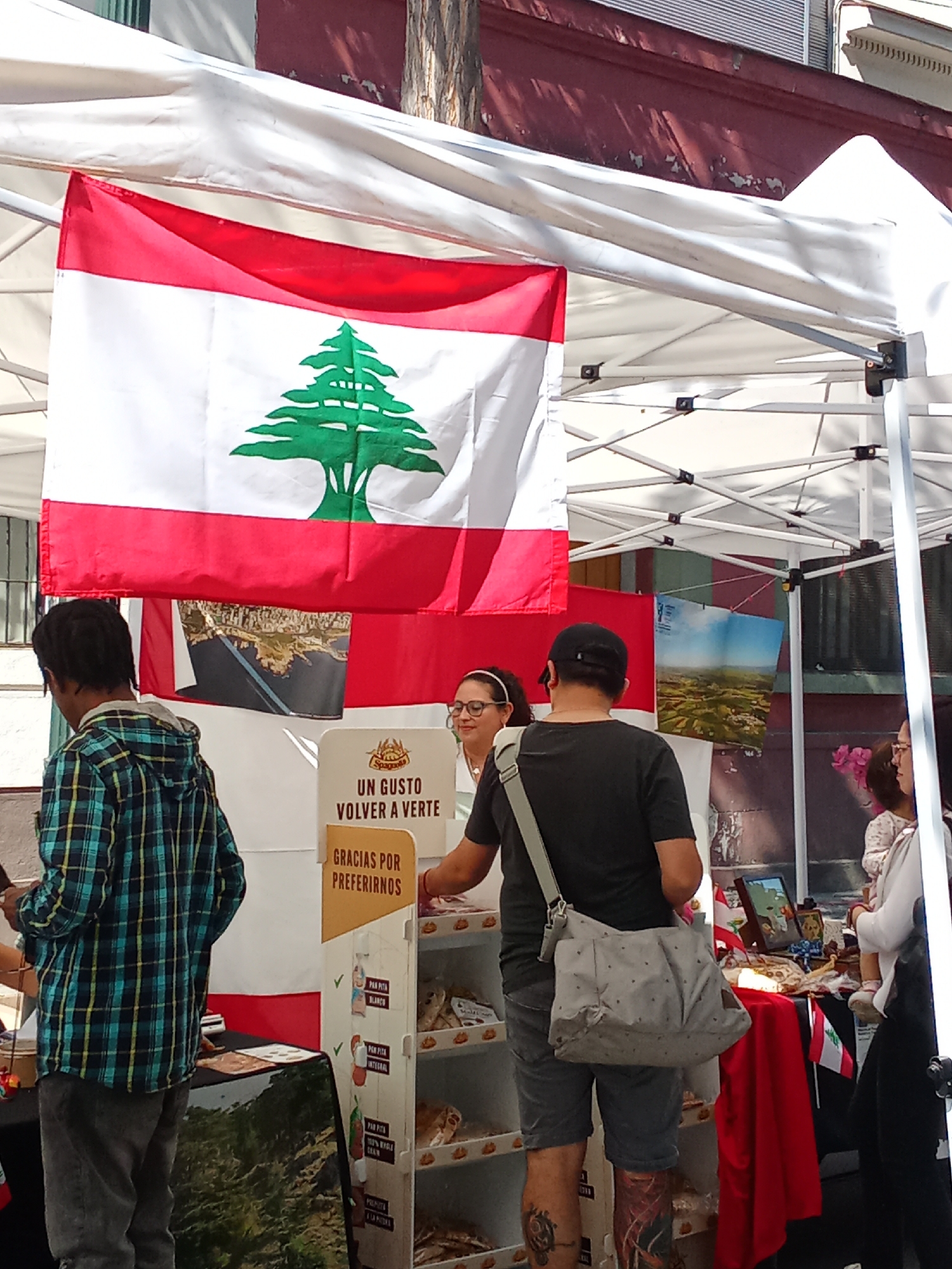 The image captures a scene at an outdoor market in Providencia, Chile. A booth adorned with the flag of Lebanon prominently hangs from the tent structure. There is an olive-skinned woman wearing glasses standing behind the counter of the stall and a man with a gray tote bag looking at her. Other patrons including one in a blue and black plaid shirt are standing at the booth. The booth features promotional signs and display shelves stocked with pita bread. A sign reads "UN GUSTO VOLVER A VERTE," and lists bread types in Spanish. Small flags, possibly Peruvian, are also visible on the countertop. The setting is sunny, with the market booth situated against a building with a red facade. The booth is enclosed under a large white tent.