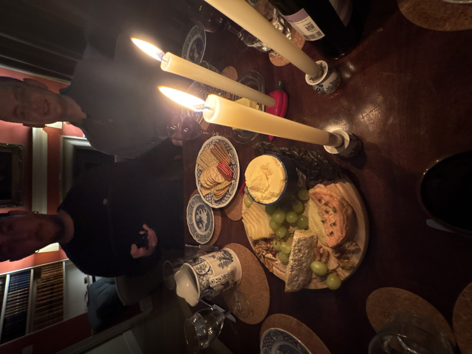 A dimly lit table displays a cheese board with grapes, various cheeses, and butter. Crackers sit on a separate plate. Three tall, lit candles in ceramic holders cast a warm glow. A bottle of wine rests nearby. Two individuals are visible, one holding a phone, partially obscured by the table and candlelight. Decorative plates and a patterned pitcher add to the table's setting.