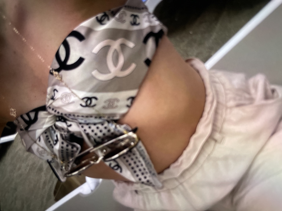 This image depicts a close-up view of a person's upper right arm, shoulder, and upper torso, taken in Cherven Bryag, Bulgaria. The individual's fair-toned skin is visible. A multi-patterned scarf, featuring prominent interlocking "CC" logos in black, white, and gray, along with a section of black polka dots on a white background, is tied around the upper arm. A pair of sunglasses with dark lenses and a metallic frame is clipped onto the scarf on the outer side of the arm. A delicate, thin gold-toned chain necklace with a small, indistinct pendant is visible around the neck and collarbone area. The person is wearing light pink clothing, possibly soft trousers or sweatpants, which are visible from the upper thigh to the waist, showing a gathered elastic waistband. The background is out of focus, indicating an indoor setting with no discernible details.