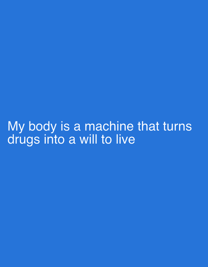 The image displays white text centered against a solid royal blue background. The text reads: "My body is a machine that turns drugs into a will to live." No other subjects, objects, people, actions, or interactions are present. The environment consists solely of the blue background. The location in the city of North Vancouver, Canada, cannot be determined from the provided image.