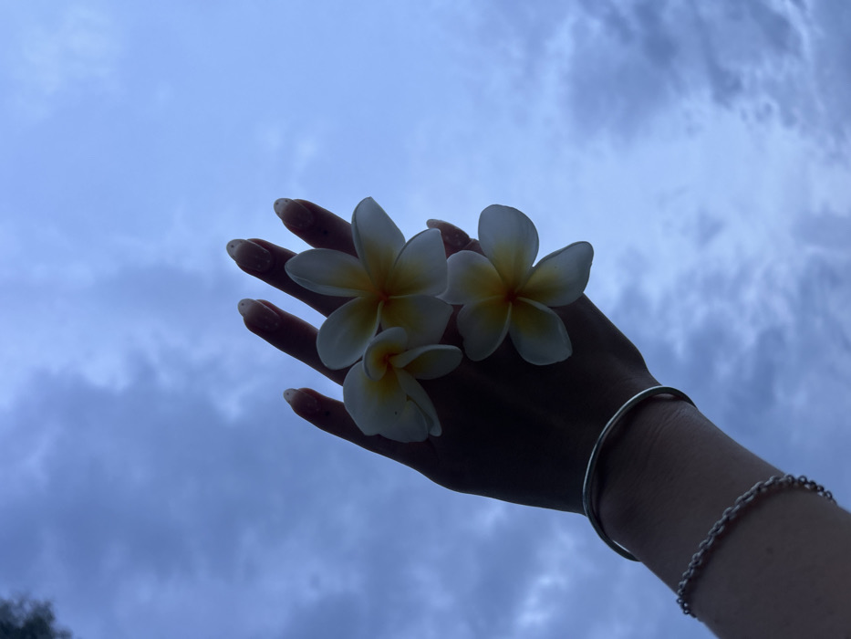 A human hand, silhouetted, is positioned in the foreground, extending upwards and slightly right against an overcast blue-grey sky. The hand holds three frangipani flowers (Plumeria), identifiable by their white petals with yellow centers. A silver-colored metal bangle encircles the wrist, with a silver-colored chain bracelet positioned lower on the forearm. Fingernails are discernible, appearing light-colored at the tips. The background consists solely of a cloudy sky, indicating diffused, backlit conditions. The scene is located in Corrimal, Australia.