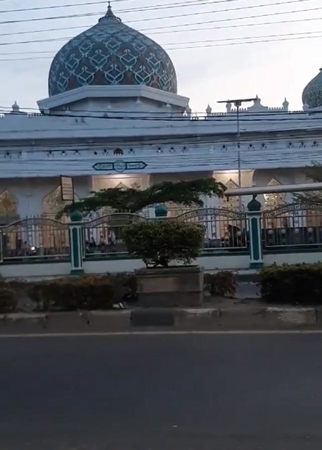 view of a mosque from across the street. The mosque is white with a large, patterned blue and white dome. A small tree is planted in front of the mosque near the sidewalk. People are visible walking inside the mosque. Cars pass by on the street in front of the mosque. The sky is light gray, suggesting either dawn or dusk. An Islamic call to prayer is audible.