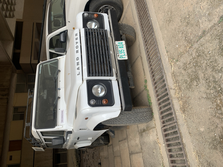 The image presents a static scene featuring a white Land Rover Defender, positioned front-left three-quarters view. The vehicle has "LAND ROVER" embossed on its hood, a black grille, circular headlights, and amber turn signals. A black bumper carries a green Nigerian license plate, "PLATEAU PL95 A04," identifying its registration in Plateau State, Nigeria, which includes the city of Jos. A white rectangular sticker containing alphanumeric text is visible on the lower windshield. The vehicle is equipped with a black roof rack, from which a small white rectangular object extends upwards on the left side. To the right and rear of the Land Rover, a portion of a second white SUV is visible. Both vehicles are situated on a paved surface constructed from concrete slabs, which transitions to an unpaved, dirt ground. A rusty metal drainage grate extends horizontally across the foreground. In the background, a multi-story building with multiple windows and a concrete facade is visible. No individuals are present, and no active interactions are depicted. The scene suggests a parking area within the city of Jos, Nigeria.