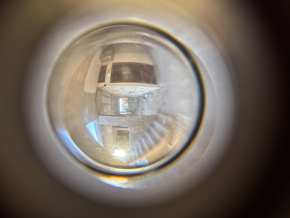 The image displays a wide-angle, circular, distorted view, consistent with having been captured through a peephole or similar lens, showing significant barrel distortion and chromatic aberration, particularly rainbow-colored fringing, around its periphery
