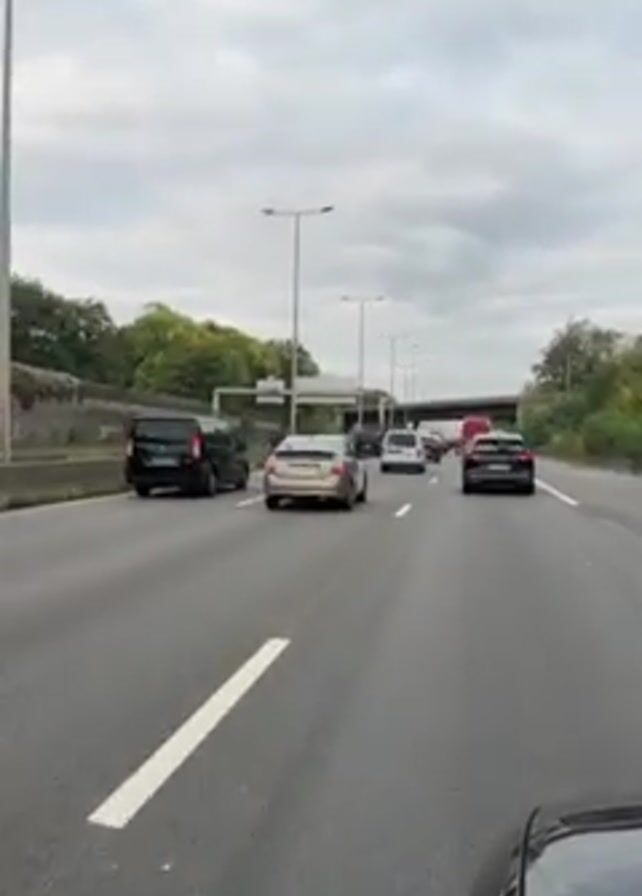 highway with several lanes of traffic on an overcast day. Cars, vans, and a motorcycle are visible. The camera appears to be inside a vehicle, facing forward. The road has white lane markings. There are street lights alongside the highway. Trees can be seen on the side of the road.