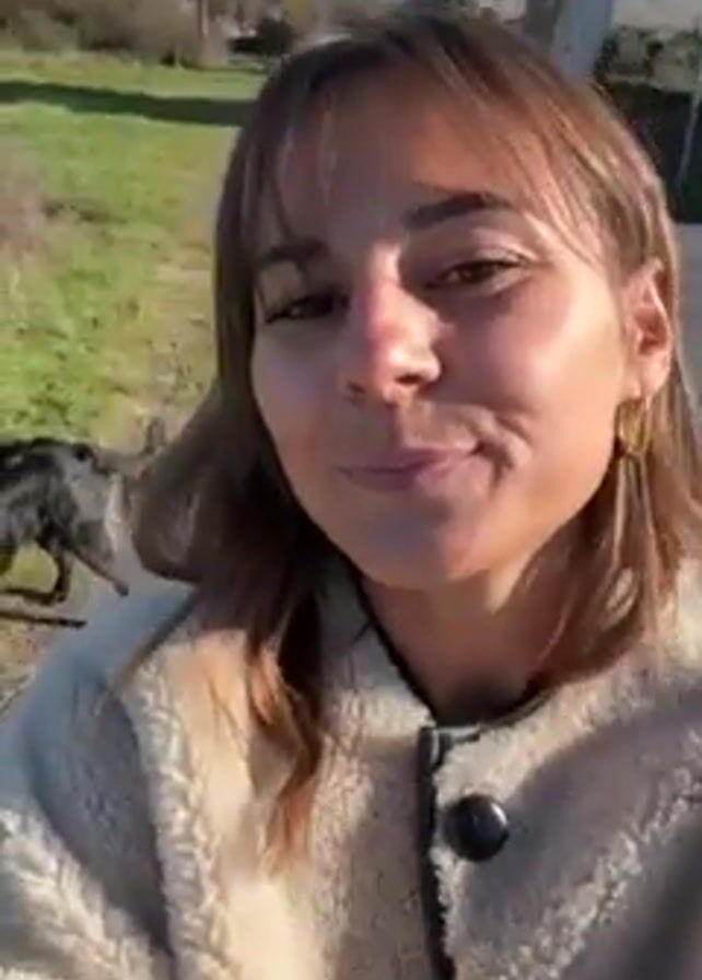 A woman with brown hair and bangs, wearing a cream-colored fleece jacket and gold hoop earrings, stands outside on a sunny day. She is looking directly at the camera and speaking. Behind her is a green grassy area and a building. Electrical wires stretch across the sky. The camera angle is from a low point, looking up at her.