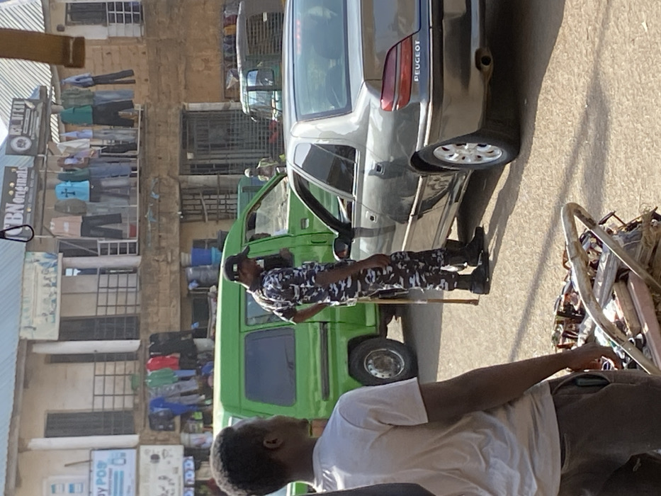 This image depicts a daytime street scene in Bukuru, Nigeria, characterized by urban commercial activity. In the foreground, positioned to the left, a male individual with dark skin, wearing a light-colored short-sleeved shirt and dark trousers, stands with his back partially towards the camera. He is adjacent to a metal cart filled with various small items, including what appear to be packaged goods and eyeglasses. In the midground, a male figure wearing a dark camouflage uniform and a dark baseball cap stands on the driver's side of a dark grey Peugeot 406 sedan. He holds a light-colored wooden stick or baton vertically in his left hand and is leaning towards the open driver's side window of the sedan, seemingly interacting with the occupant(s) inside. The sedan is parked or stationary on an unpaved, dusty road surface. Directly behind the uniformed man and the sedan is a bright green van with tinted windows. Further in the background, to the right of the green van, an indistinct figure stands near a partially visible three-wheeled vehicle. The background is dominated by multi-story buildings with balconies, which feature various clothing items, such as shirts and trousers, displayed on railings and hangers, suggesting retail operations. Visible signs on the buildings include "BN Originals," "Pay POS," and "LGL WEST." The scene is illuminated by strong sunlight, casting distinct shadows on the ground.