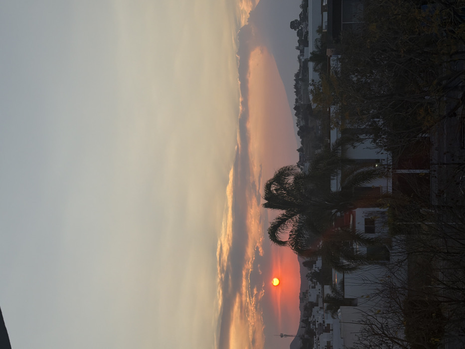 A radiant orange sun sets amidst dusky skies, partially obscured by clouds and a palm tree silhouette. The scene includes glimpses of urban buildings and tree branches. The color palette ranges from warm oranges and yellows to cool blues and greys. The image is presented in a vertical orientation.
