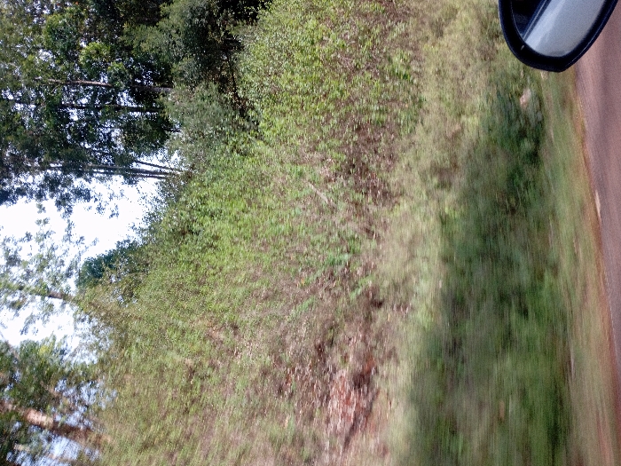 The image depicts a roadside scene in Othaya, Kenya, viewed from a moving vehicle. The foreground features the edge of a dark asphalt road with a faint white line. A black and silver car side mirror is partially visible in the bottom right corner. Adjacent to the road, a steep embankment or hillside rises, densely covered with varied green vegetation, shrubs, and small trees. Patches of reddish-brown soil are discernible through the foliage on the upper portion of the embankment. Above the hillside, a dense line of tall, slender trees with dark green canopies extends towards a bright, overcast sky. Motion blur is evident across the lower and central portions of the image, consistent with photography from a moving object. No individuals or animals are present.