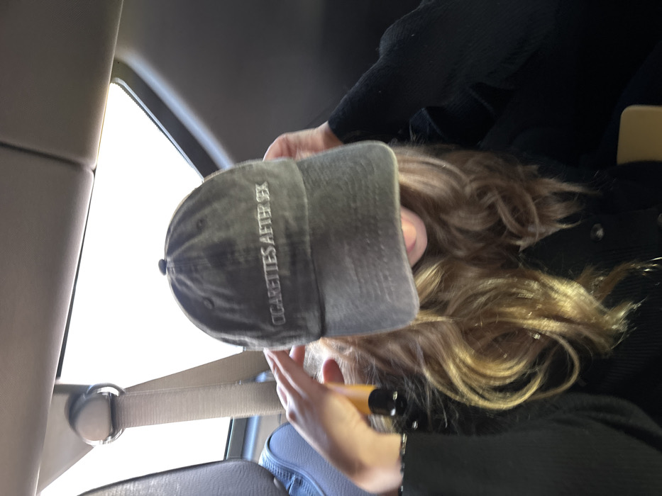 Inside a vehicle, a person wears a gray baseball cap with "CIGARETTES AFTER SEX" embroidered on the side. Light-brown hair flows beneath the cap. The person wears a black jacket or coat and holds a yellow object in their hand. A seatbelt is visible, and sunlight streams through the car window. The image has been rotated counter-clockwise.